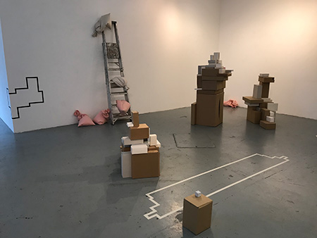 The ‘stacks’ are assembled out of multiple recycled boxes, the height and shape of the larger stacks roughly echoing my body. The over-sized outlines of boxes, marked out in tape on the floor and wall of the gallery, show the shape of (and importantly the void within) the flattened boxes before reassembly.